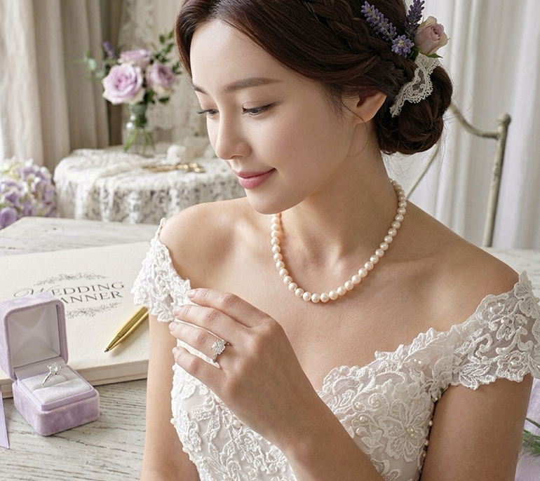 婚約・結婚指輪だけでなく、冠婚葬祭に欠かせない「一生モノの真珠ネックレス」の選び方を伝授。挙式当日のドレスの襟元や、顔合わせの服装に合わせたパールの見せ方をプロが提案します。